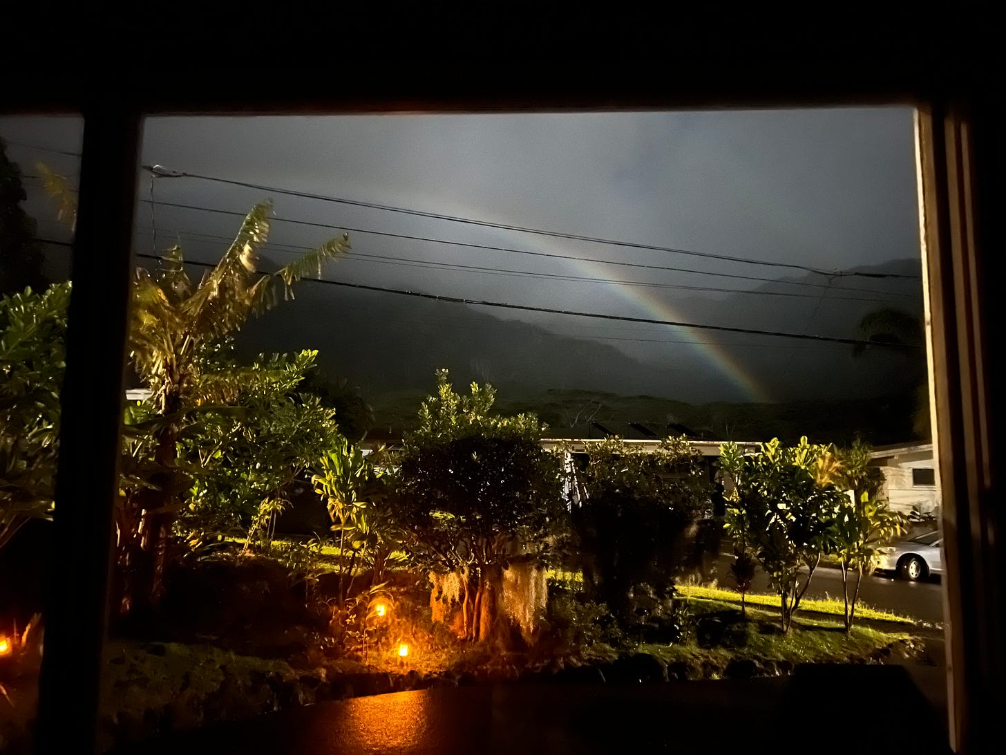 In Hawaii there’s something called a moonbow. It’s sort of mythical and I had never seen one. It’s basically a rainbow at night where the moon is providing the light. The very first night of editing, it was like 2 a.m. and I took a walk through the yard. There was this ghostly bubble. I’m like is that fucking UFO or something? I look out and it’s actually a moonbow.